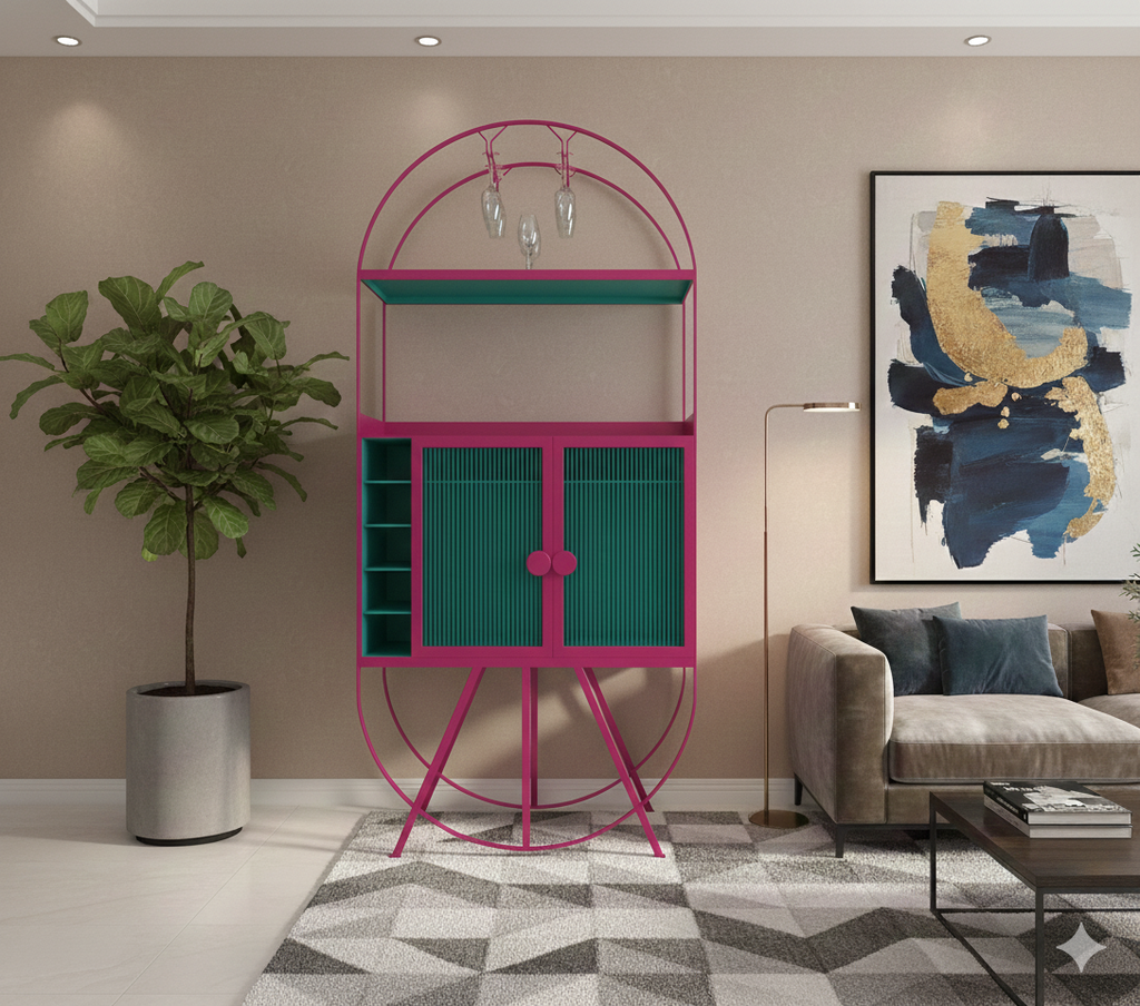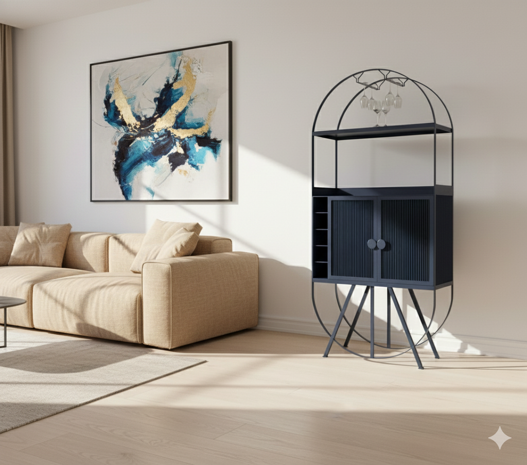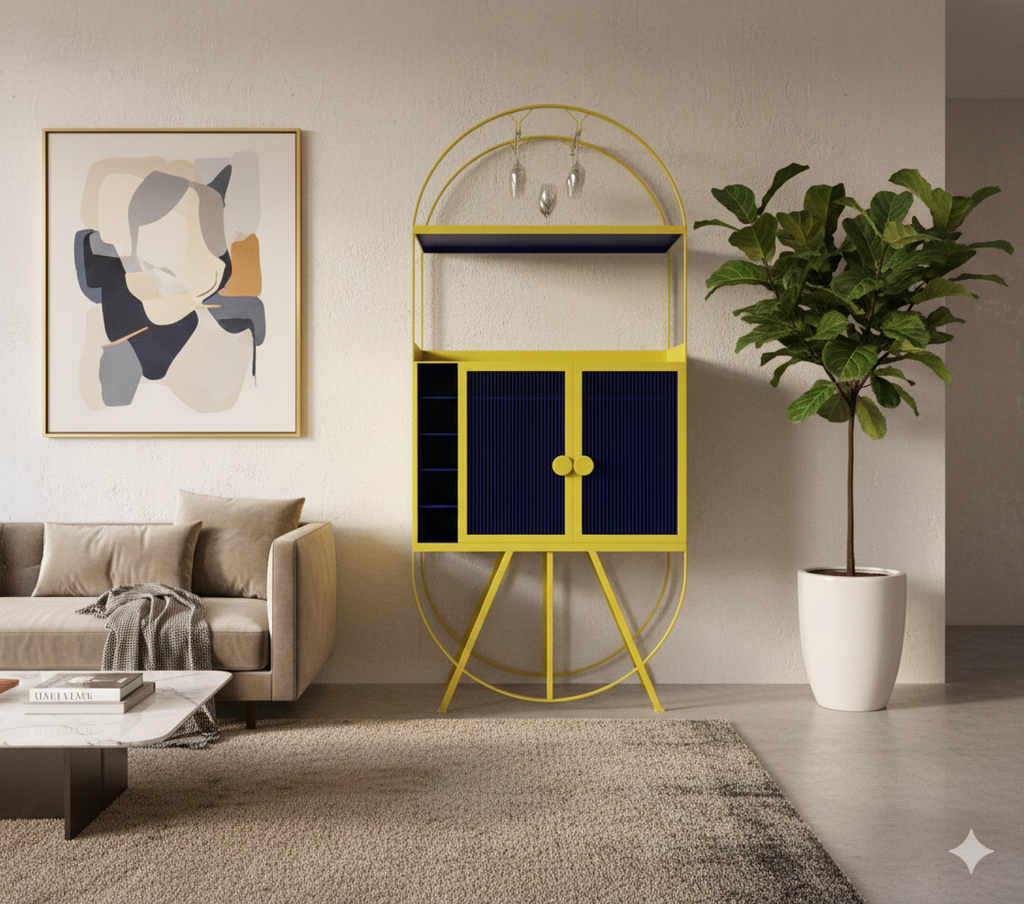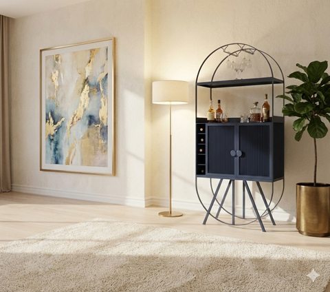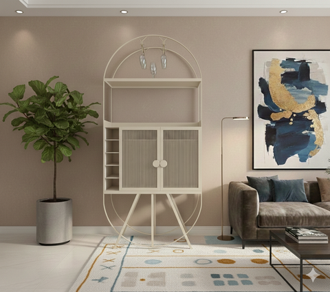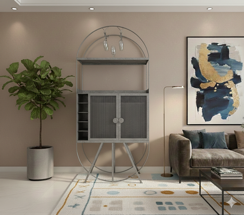 Exuding an eclectic appeal, our mini bar features five non-adjustable open shelves for bottles and an all-metal frame, and ample storage for bottles, glasses, and more.